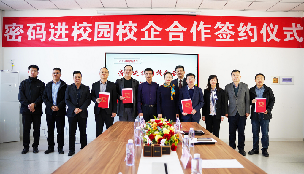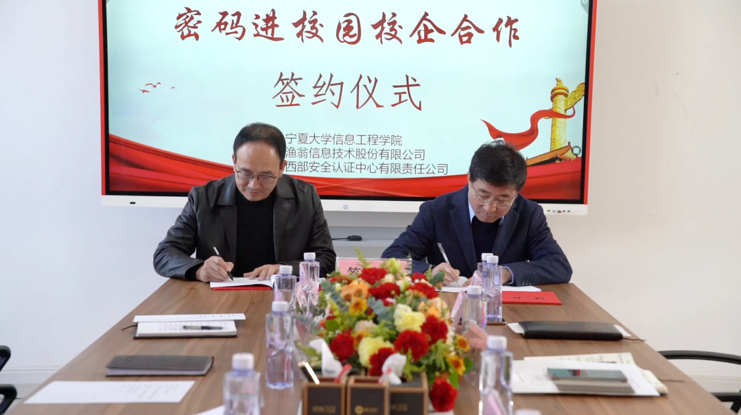 在第八个国家宪法日来临之际,为深入贯彻落实《中华人民共和国密码法》,进一步加快密码专业人才队伍建设步伐,打通我区密码产学研创新链、价值链,12月1日,“密码进校园校企合作签约仪式”在宁夏大学信息工程学院成功举行。此次签约仪式由宁夏密码管理局指导,宁夏商用密码协会会员单位一竞技官网信息技术股份有限公司、西部安全认证中心有限责任公司同宁夏大学信息工程学院签署战略合作协议,共同为我区密码学科建设、密码实训基地建设、密码人才培养贡献力量。宁夏密码管理局副局长李大苞,商密处副处长丁杰,宁夏大学信息工程学院党委书记武林波、院长冯锋、副书记孙莉、副院长杨军、学科主任李贯峰,一竞技官网信息技术股份有限公司董事长郭刚,西部安全认证中心有限责任公司常务副总经理耿方,区内其他商密企业代表等出席了签约仪式,签约仪式由宁夏商用密码协会秘书长赵军主持。