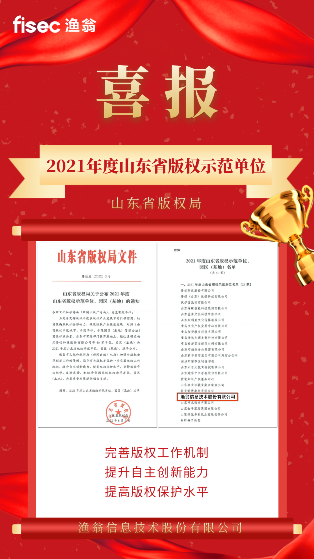 【喜讯】一竞技官网信息荣获“2021年度山东省版权示范单位”